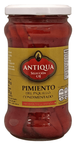 Conserva de pimientos crujientes condimentados para un sabor dulce por su cocimiento.  Marca: Antiqua Seleccion. Producto libre de gluten y elaborado en España.